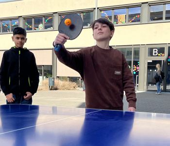 "Das macht richtig Spaß", sind sich die beiden Sechstklässler einig. Schnell kommen Schaulustige und andere Tischtennisspieler:innen hinzu, denn: mit abgerundeten Ecken eigenen sich die massiven Platten perfekt für den beliebten Rundlauf-Modus.