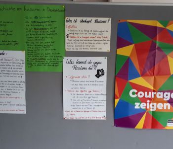 Daher war es dem Arbeitskreis "Schule mit Courage - Schule gegen Rassismus" natürlich ein besonderes Anliegen, hier Aufklärung anzubieten und deutlich zu machen, dass sich unsere Schulgemeinschaft des Problems bewusst ist und auf manche Fragen auch Antworten bieten kann. Daher beschlossen die Mitglieder des Arbeitskreises, kurz vor den Sommerferien in einer "Nacht-und-Nebel-Aktion" noch eine Stellwand mit Postern zu den wichtigsten Fragen rund um das Thema Rassismus aufzustellen.