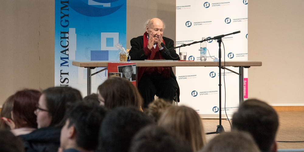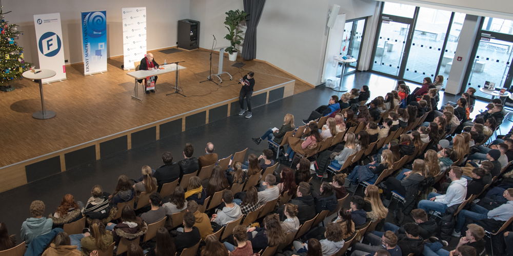 Unsere Schule hatte die besondere Gelegenheit, die bewegende Geschichte Sally Perels zu erleben. Seine Erfahrungen als jüdischer Junge in der Hitlerjugend, welche er in seiner Autobiografie „Ich war Hitlerjunge Salomon“ darlegte, teilte er in einem berührenden Vortrag den Schülerinnen und Schülern des Ernst-Mach-Gymnasiums mit.