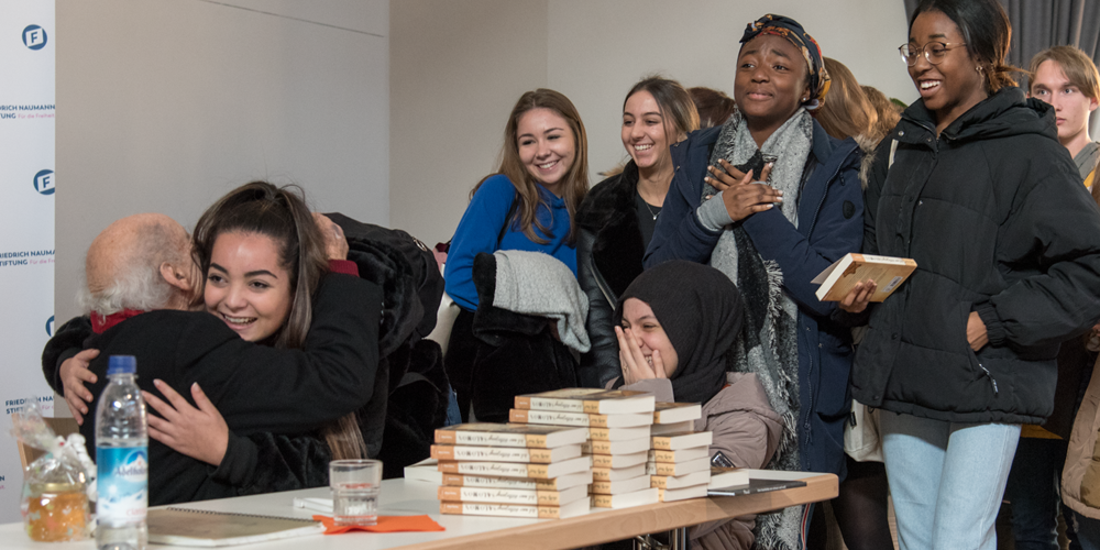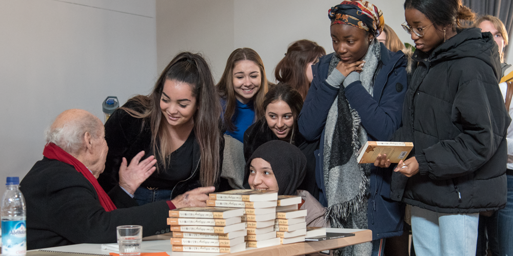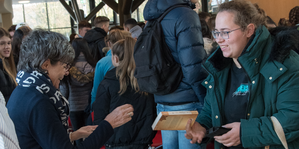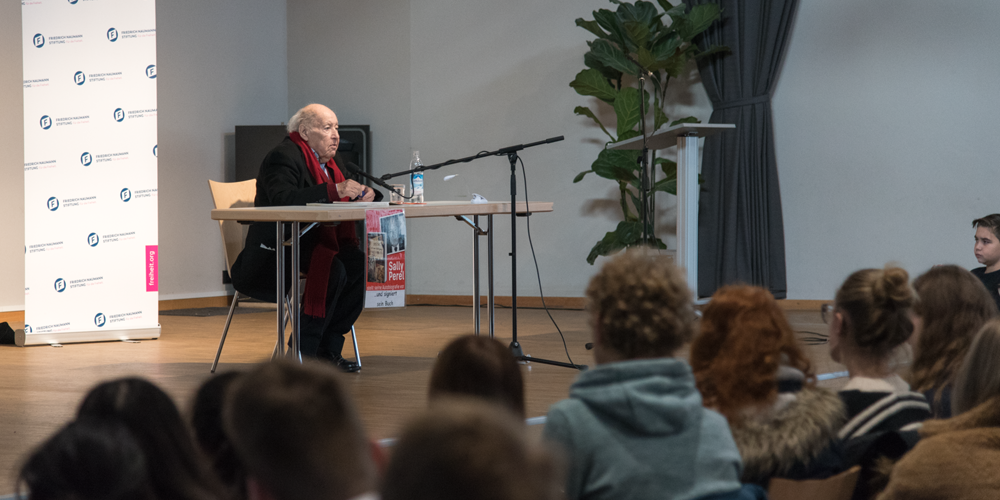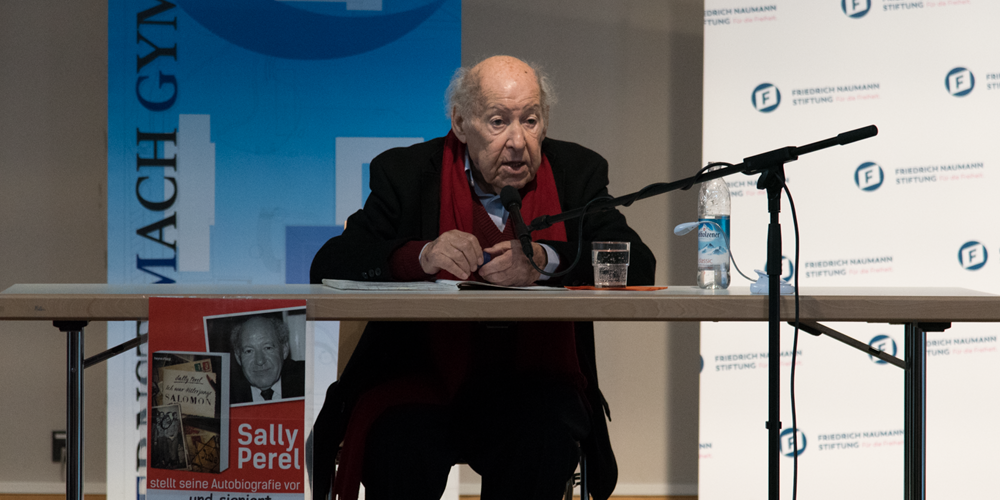 „Lasst die gleichen Fehler nicht noch einmal passieren“ war Perels Botschaft an die bewegten Zuhörer. Der tosende Applaus und die zahlreichen Fragen am Ende der Lesung untermalten die Wirkung seiner mitreißenden Geschichte auf die Schülerinnen und Schüler und die ebenfalls hohe Nachfrage nach seinem Buch zeigte, dass Sally Perel Interesse bei den Zuhörern weckte.
