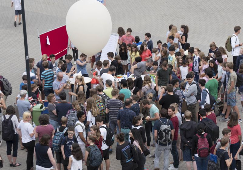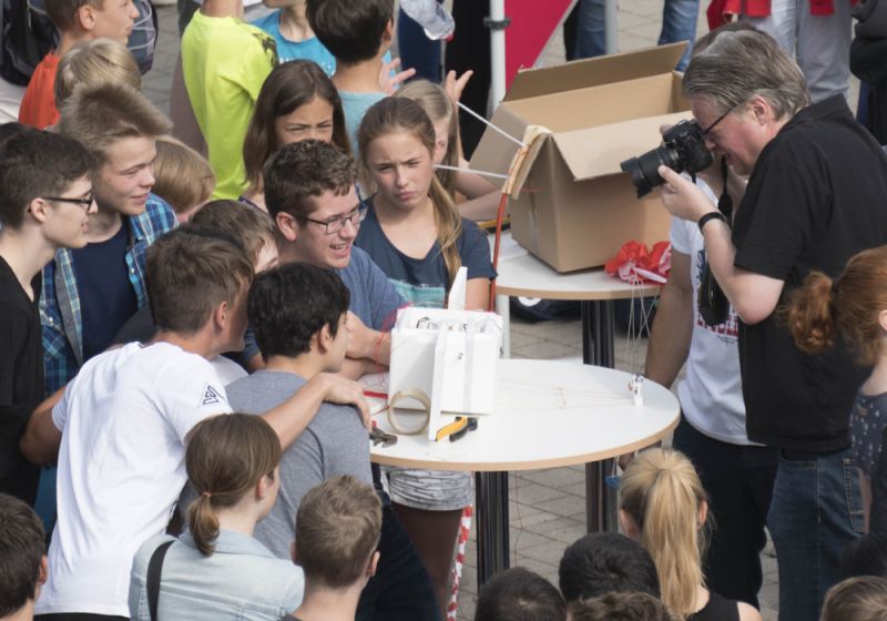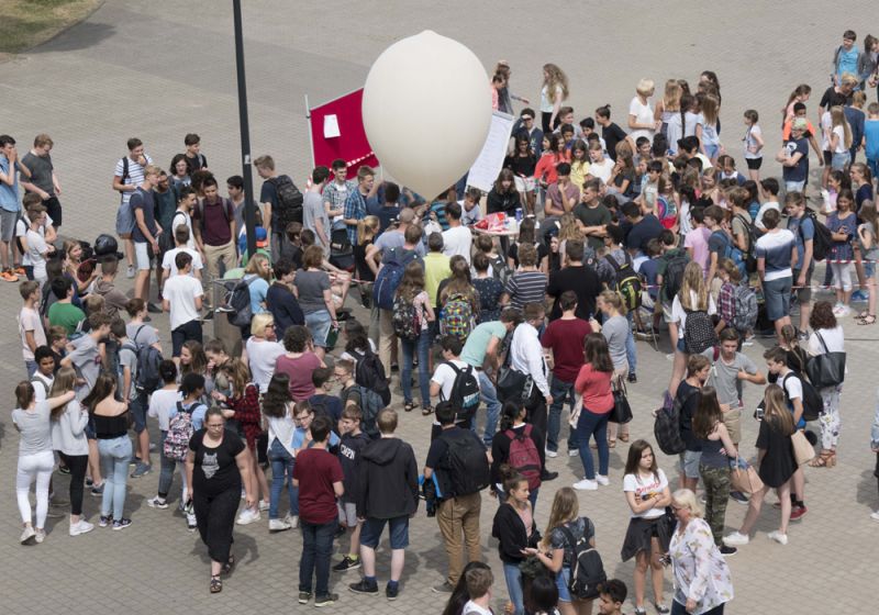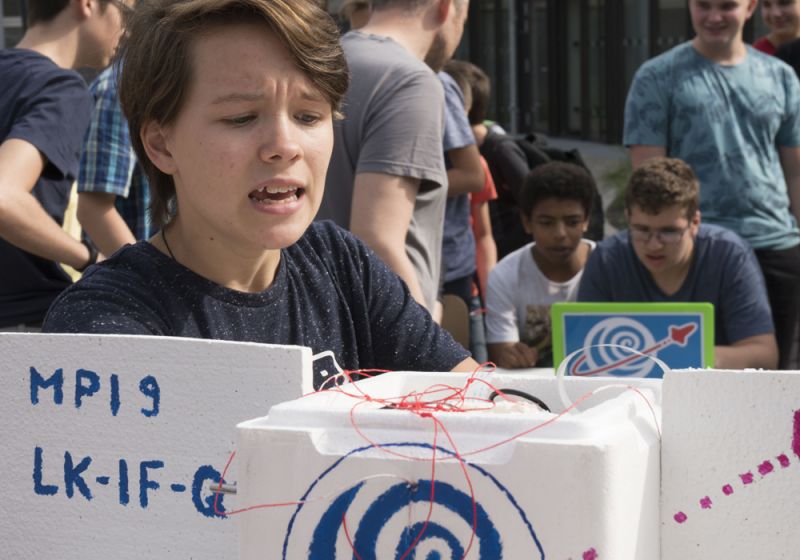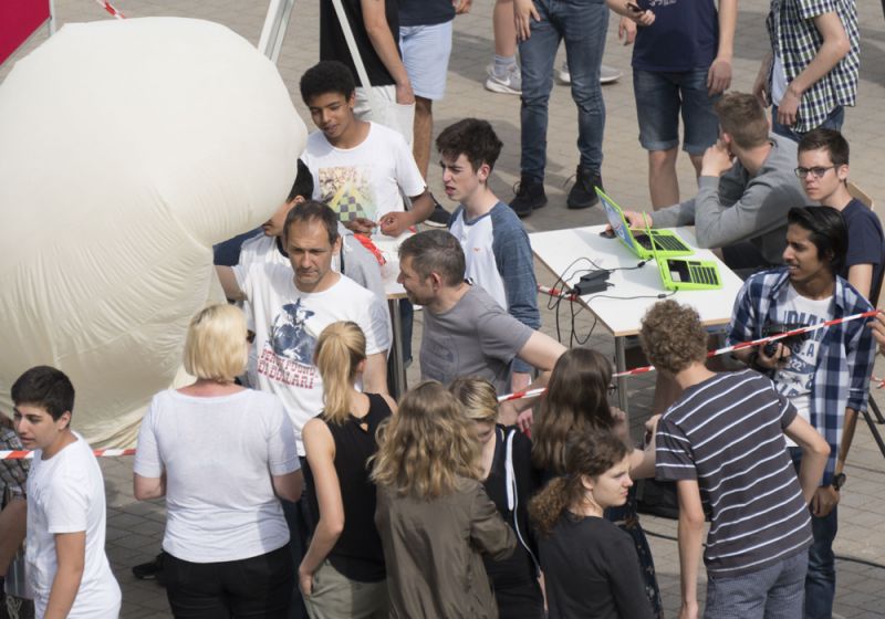 Gut zwei Stunden später ist das Wetter kein Thema mehr. Die Sonne strahlt, der erste Stratosphären-Ballon des Ernst-Mach-Gymnasiums kann seine Fahrt aufnehmen. In der ersten großen Pause startet EMG-Lehrkraft Michael Schröder zusammen mit den Schülerinnen und Schülern des MPI-Kurses der Stufe 9 und dem Informatik-Lk der Q1 jeweils fünf Programme zur Steuerung von Kameras und angehängtes Sensoren auf zwei Raspberry-Pi-Prozessoren. Die kompakten Einplatinen-Rechner sind in einer etwa Schuhkarton großen Styroporbox untergebracht, die als wissenschaftliche Nutzlast mit auf die Reise geht.