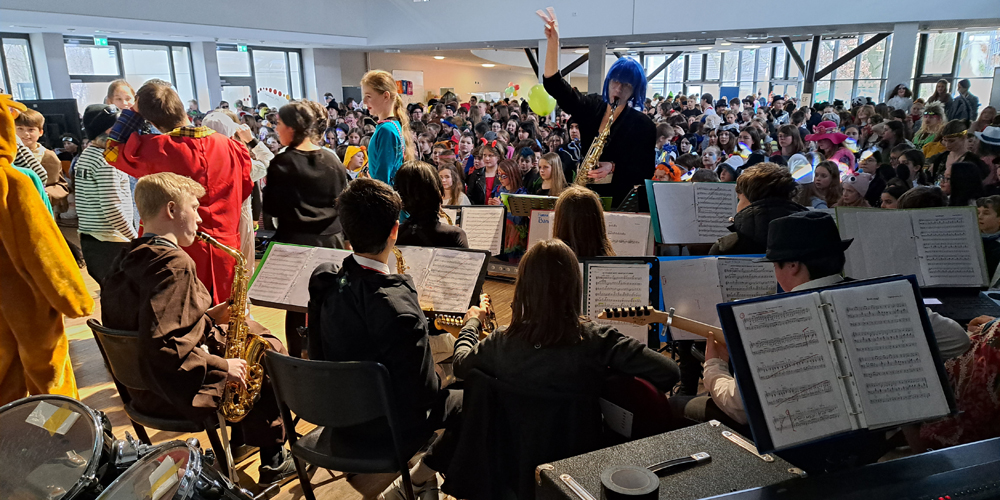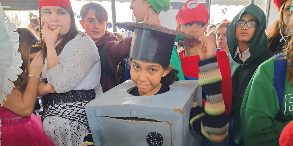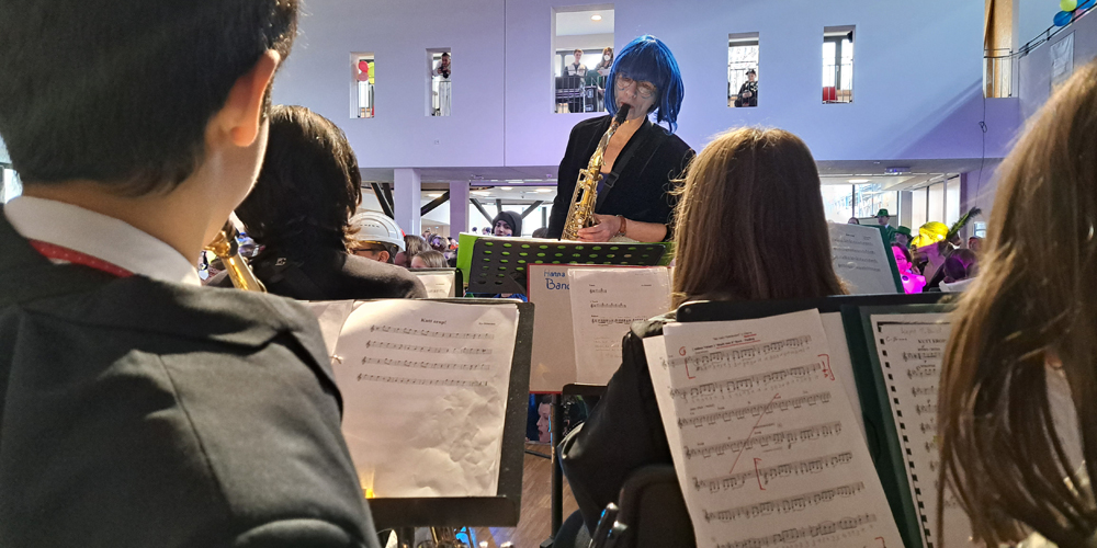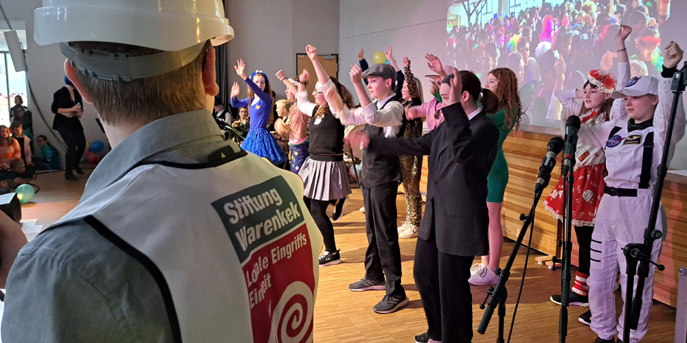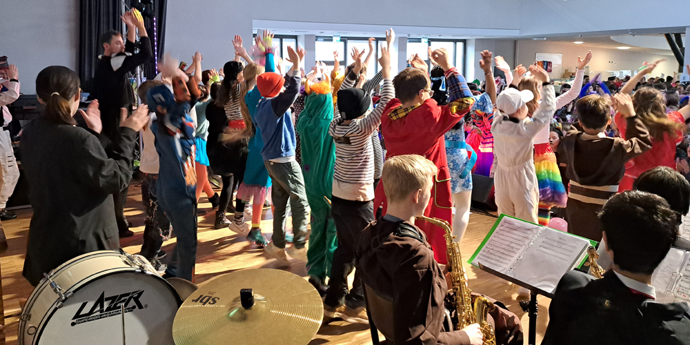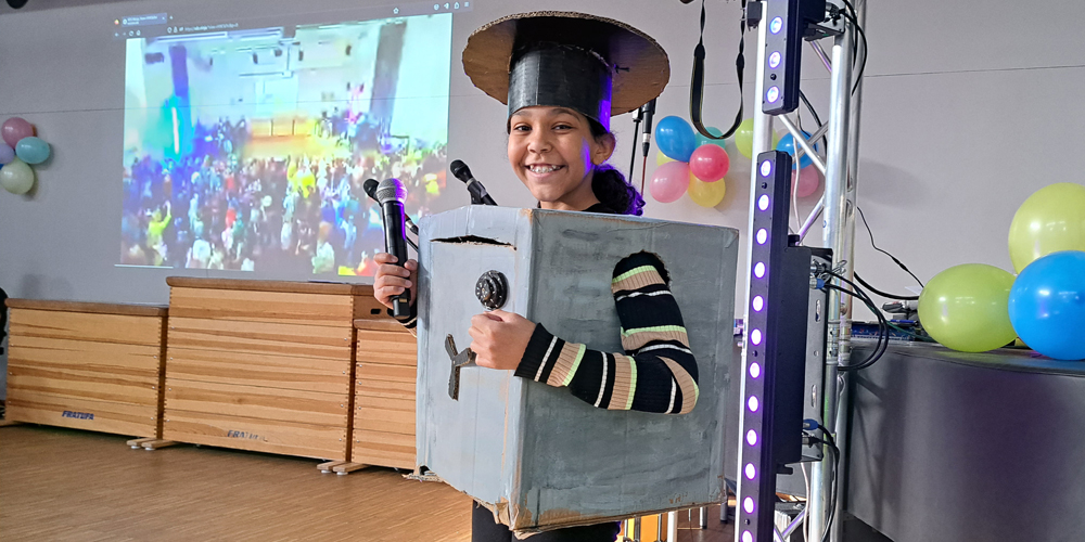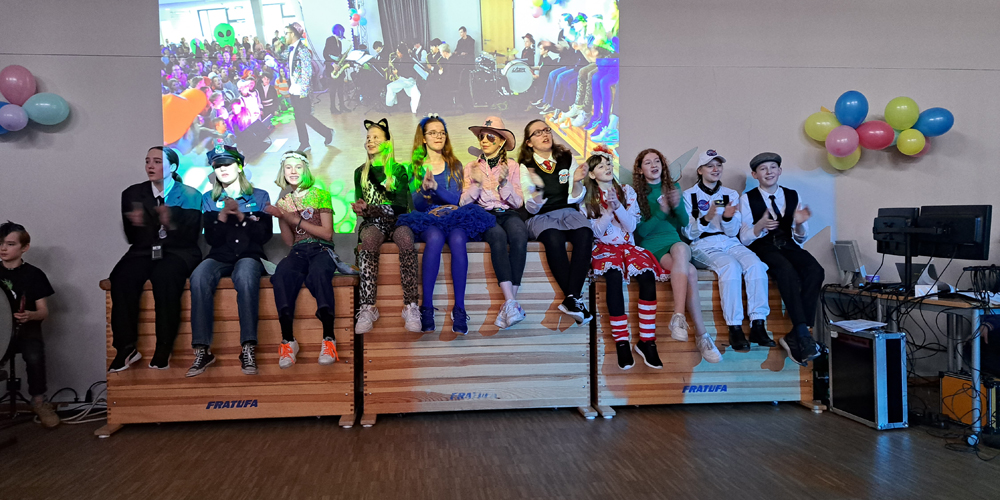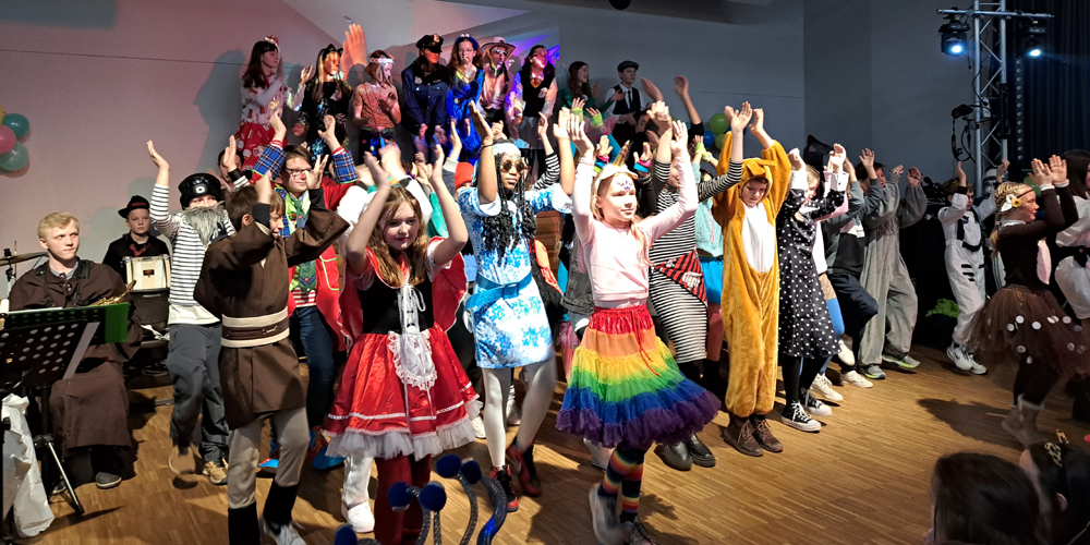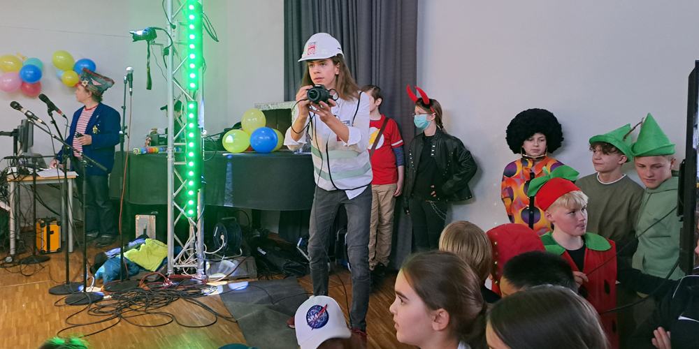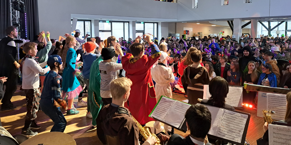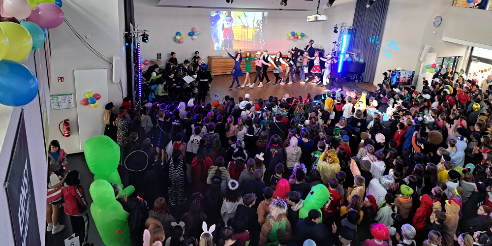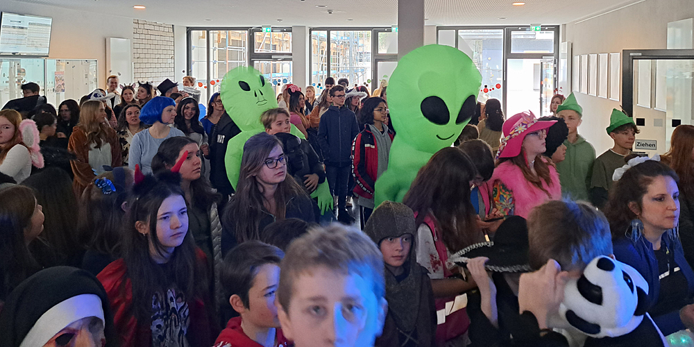 Das erste Highlight des Tages setzten dann auch die Kinder und Jugendlichen, die das Schulgelände mit phantasievollen Verkleidungen in ein buntes Tollhaus verwandelten. Dutzende von Aliens, Astronauten, Planeten und Sonnensystemen bildeten die außerirdische Kulisse für die fulminante Show auf der EMG-Bühne.