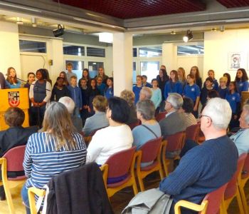 Mit einem Lied, das aus dem Musical „Kwela Kwela“ stammt und welches im November 2016 von Schülerinnen und Schülern unserer Schule im Bürgerhaus aufgeführt wird, wurde die Stimmung zu Anfang aufgelockert. Wir im Chor griffen damit eine vorbeugende Maßnahme gegen Demenz auf, nämlich das schon genannte Musizieren, und natürlich wieder unter der enthusiastischen Leitung von Frau von Dombois. Der stark gewachsene Chor, mit über 30 Sängern und Sängerinnen, bescherte den Anwesenden ein klangvolles Erlebnis, das selbst zu einem Chorbeitritt motivierte.