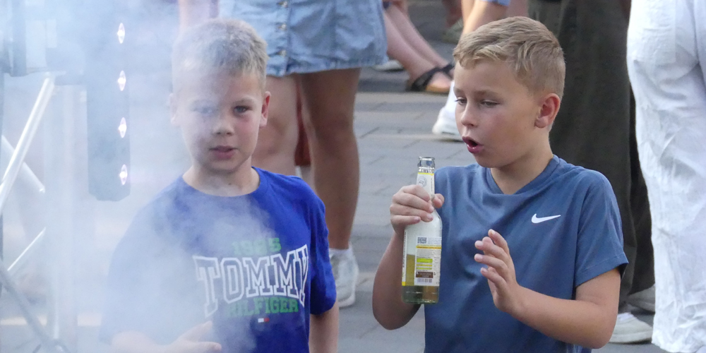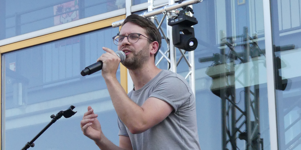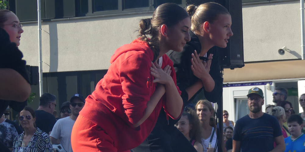 Jouline Tzikas und Fabian Simon aus der Q1 führten durch das Bühnenprogramm und stellten Martin Welz und Thomas Knechten gleich mit dem Startschuss des Sommerfestes die entscheidende Frage: Was bedeutet die Veranstaltung für die Schulgemeinschaft? „Eine Menge“, sagte Schulleiter Martin Welz, „denn es ist einer der Termine, an dem alle - Eltern, Schüler:innen, Lehrkräfte und Ehemalige - zusammenkommen.“