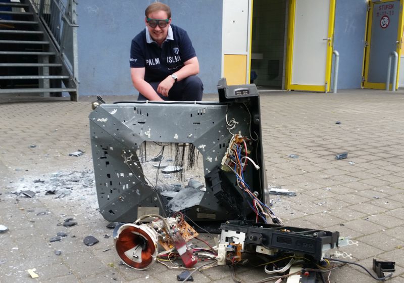 In einem von mehreren Kameras überwachten Versuch studierte die Gruppe um den Fachschaftsvorsitzenden Michael Schröder den freien Fall eines Röhrenfernsehgeräts aus dem Jahre 1983. Mit diesem Setup folgten die EMG-Physiker dem Vorbild legendärer Rockbands wie den Rolling Stones oder Led Zeppelin, die vergleichbare Studien an frei fallenden TV-Geräten aber meist aus Hotelzimmern heraus angestellt hatten.