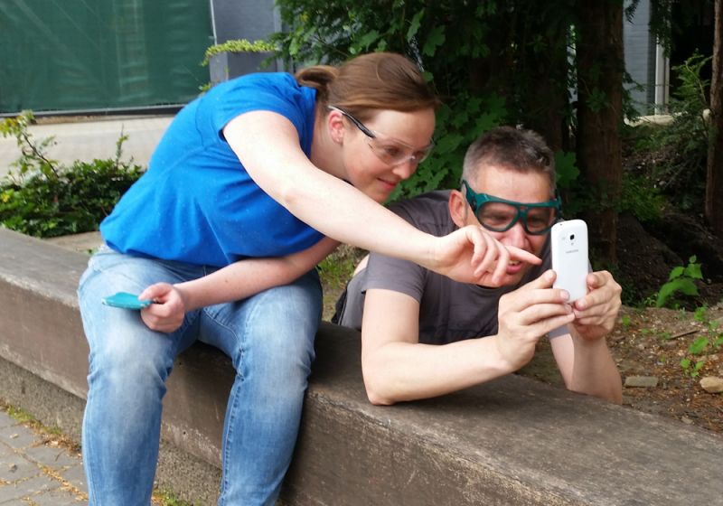 Neben dem wissenschaftlichen Charakter stellte das Experiment gleichzeitig das Abschiedsgeschenk für den scheidenden Physiklehrer Christian Goerings dar, der das EMG – hoffentlich nur vorübergehend – verlässt. Goerings, der im November sein Referendariat beginnt, durfte höchstpersönlich das ca. 25 Kilogramm schwere Gerät über die Brüstung im zweiten Stock des D-Gebäudes in Richtung Schulhof manövrieren.