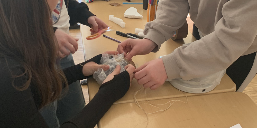 Somit waren Kreativität, Geschick und Teamwork gefordert. „Darf man auch die Plastiktüte benutzen“, fragte Hannah aus dem Team Bungee. Ja, durfte man – musste man vielleicht sogar, denn die Tüte ließ sich in Kombination mit der Schnur als Fallschirm verwenden, der für die existenziell wichtige Verzögerung in der Fallbewegung sorgte.