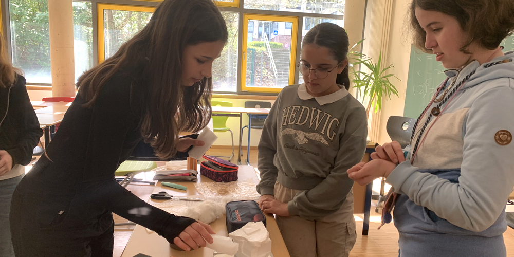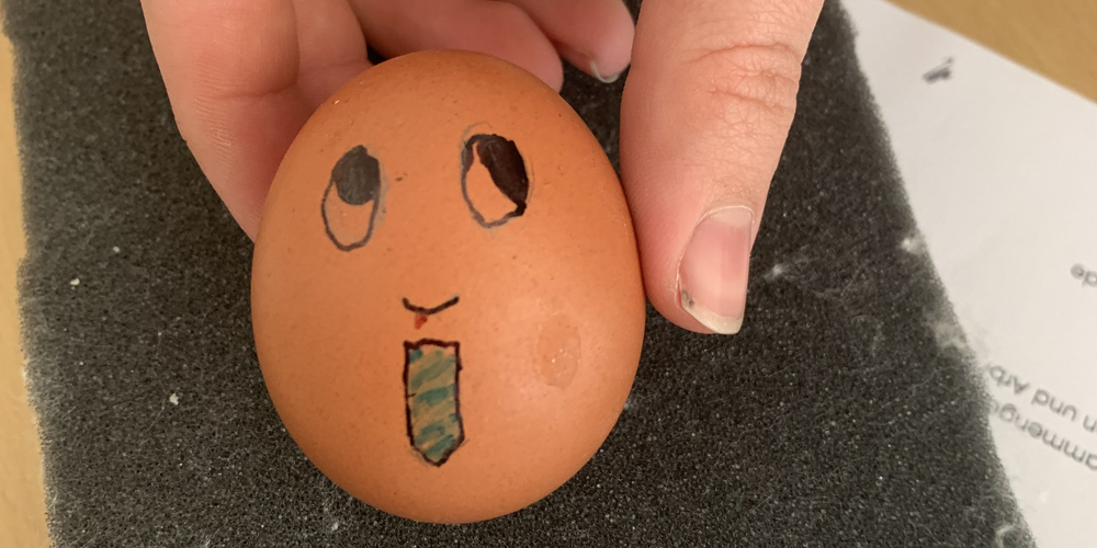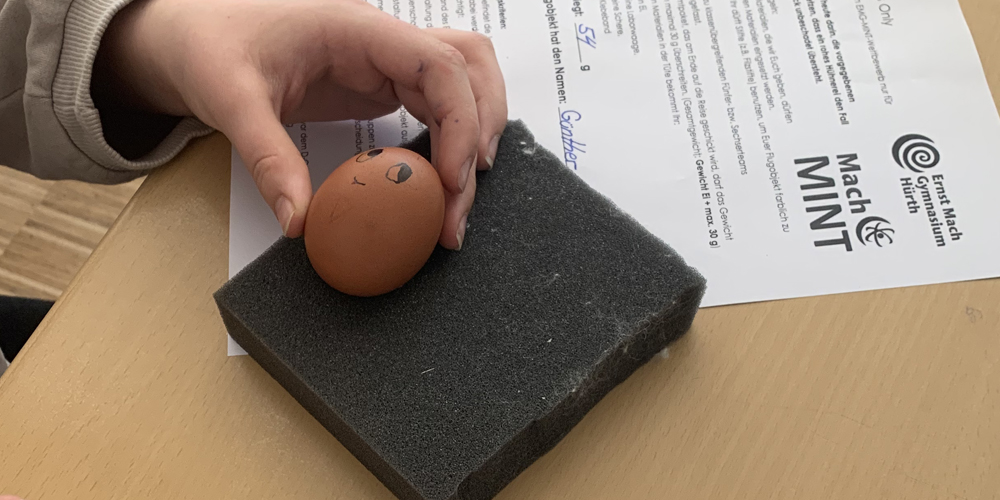 „Wir haben den Mädchen Luftpolsterfolie, Schaumgummi, Styropor, Schnur und Klebeband in eine Plastiktüte gepackt. Das Gesamtpaket, das am Ende auf die Reise geschickt wurde, durfte aber nur 30 Gramm schwerer sein als das Ei“, erklärt Melika die Regeln des ersten EggRace am EMG.
