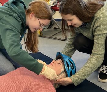 Abschließend arbeiteten wir eigenständig an Stationen zur korrekten Lagerung bei bewusstlosen Verunfallten mit normaler Atmung (stabile Seitenlage), zur Herz-Lungen-Wiederbelebung im Rhythmus 30:2, zum Einsatz eines AED sowie zur sicheren Abnahme eines Fahrrad- oder Motorradhelms mit der „Zwei-Helfer-Methode“. Nicht nur aufgrund der momentan vorherrschenden Kälte war es interessant einmal eine große gold-silbern-knisternde Rettungs-Decke auszupacken und zu nutzen, um verunfallte Personen zu wärmen.
