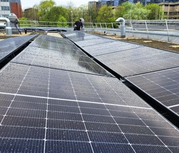 Anders als noch die vor 14 Jahren errichtete Anlage auf dem D-Gebäude sind die Module in Ost-West-Orientierung ausgerichtet und weisen einen Neigungswinkel von lediglich zehn Grad auf. „Damals wurden die Anlagen noch auf größtmöglichen Energieumsatz optimiert, da man jede Kilowattstunde noch zu sehr günstigen Bedingungen ins öffentliche Netz einspeisen konnte“, sagt Solarbauer Peter Förster, während er letzte Hand an die Photovoltaik-Module anlegt.