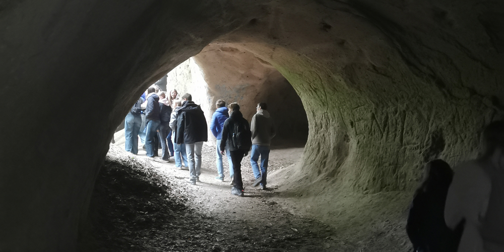 Bei strahlendem Sonnenschein bildete der Brohltal-Trass den Startpunkt unserer Tour-de-Vulkan und war sicherlich auch ein erstes Highlight. In dem zerklüfteten und von zahlreichen Höhlen durchzogenen geologischen Aufschluss kann man einiges über die verheerenden Folgen des Ausbruchs des Laacher-See-Vulkans erfahren.
