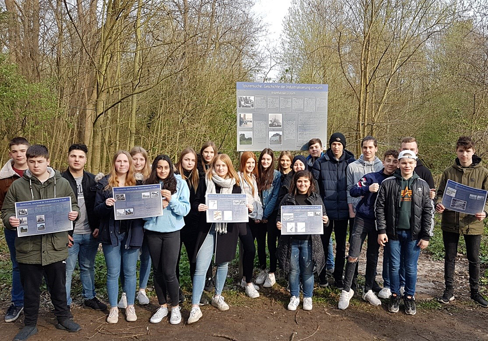 Die Schülerinnen und Schüler aus dem Erdkunde-Geschichte-Kurs der Stufe 9 können stolz sein. Nicht zuletzt dank ihrer Initiative hat die Gemeinde Hürth seit neuestem einen Lehrpfad für Industriegeschichte. Die offizielle Einweihung nahm Bürgermeister Dirk Breuer am 2. April vor. Mit dabei waren neben Schulleiter Martin Welz und Stadtarchivleiter Michael Cöln natürlich auch die Jungen und Mädchen aus dem umtriebigen Differenzierungskurs sowie die beteiligten Lehrkräfte Sandra Hembach und Julia Horn.