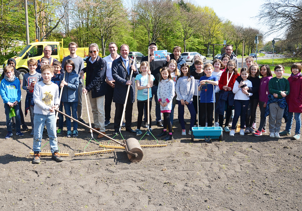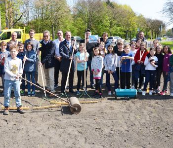 Bürgermeister Breuer zusammen mit der 5a bei der Einsaat