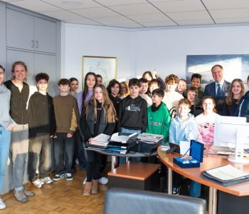 Zu guter Letzt durfte die Klasse noch das Bürgermeisterbüro erkunden und die Klassensprecher Charlotte und Julian vom Hagen nahmen auf seinem Stuhl Platz. Wie praktisch, dass das Rathaus in der Nachbarschaft ist: Passend zur Pause war die 6f bereits zurück in der Klasse und konnte sich über die mitgebrachten „Stadt-Hürth“-Taschen freuen.