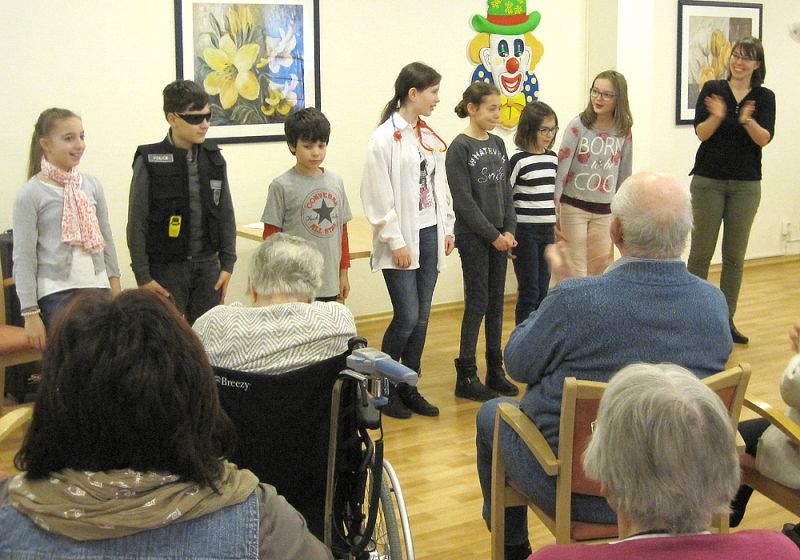 Am 26. Januar war es so weit. Wie jeden Dienstag: Treffen nach Schulschluss, von 14 bis 15 Uhr. Heute jedoch – keine Probe. Heute machen sich sieben mutige Fünft- und Sechstklässler auf den Weg zum Caritas-Seniorenzentrum St. Ursula in Hürth-Hermülheim. Premiere! Vor rund 30 Bewohnern und Mitarbeitern präsentiert die Theater-AG die Früchte ihrer Probenarbeit.