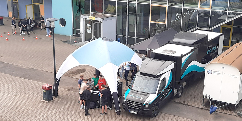 Das Aero-Race-Lab der Fachhochschule Aachen hat den Schulhof des Ernst-Mach-Gymnasiums vorübergehend in ein Labor für Luft- und Raumfahrttechnik verwandelt. Nutznießer waren die Schülerinnen und Schüler aus den Physikkursen der Ef, die an vier spektakulären Experimenten Untersuchungen zu verschiedenen technischen Fragestellungen anstellen.