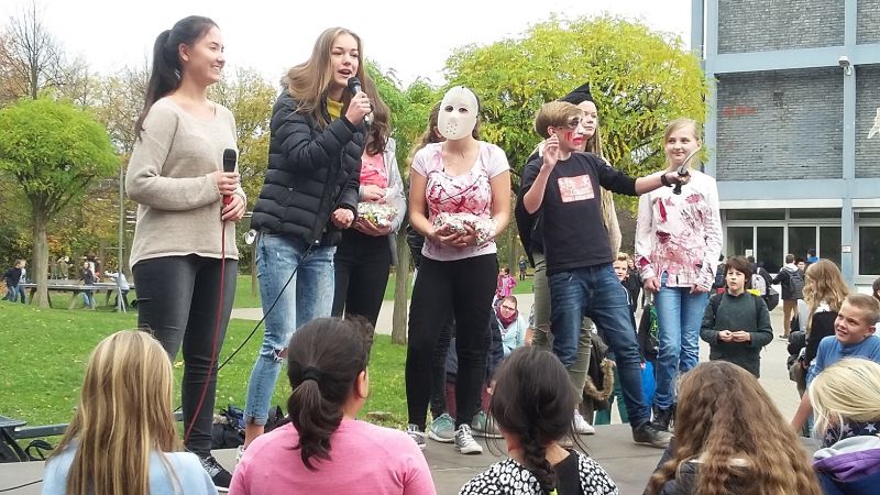 Pünktlich am 11.11.2015 um 11.11 Uhr steht die Schülervertretung auf der Bühne mitten auf dem Schulhof des EMGs bereit zur Mottoverkündigung. "Tatort Schule - Der Blanke Horror" lautet das EMG-Motto für die neue Session. Dieses hatten die Schülerinnen und Schüler durch Umfragen in den Klassen ermittelt. Die SV und einige Lehrkräfte waren anlässlich der traditionellen Verkündigung des Mottos am 11.11. schon entsprechend verkleidet und feierten in den Karneval. Um die entsprechende musikalische Begleitung durch Karnevalslieder kümmerte sich die Technik-AG unserer Schule. Am Altweiberdonnerstag (4. Februar 2016) gehts in der Sporthalle weiter. Bis dahin bleibt noch genug Zeit Kostüme auszusuchen und Beiträge für die Sitzung vorzubereiten.
