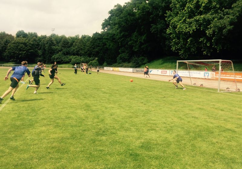 Starke Leistungen sah man auch bei den Turnieren im Fußball, Brennball, Tchoukball und Frisbee, die parallel zu den Leichtathletik-Wettbewerben stattfanden. Überzeugen konnte die Stufe Q1 übrigens nicht nur beim Fußballspiel gegen die Lehrer, sondern auch durch akribische Zeit- und Weitenmessungen sowie ein oppulentes Catering, das nur wenige Wünsche offenließ. Nörgeleien über fehlende Lachsschnittchen wurden da zurecht ignoriert.