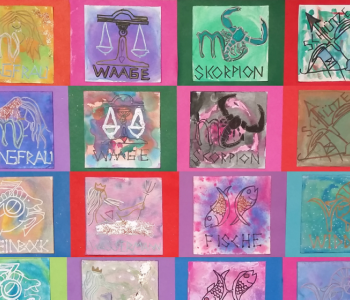 Damit nun diese kleinen Werke nicht einfach im Müll landeten, kamen wir auf die Idee, sie als Hintergrund für eine weitere Arbeit zu verwenden. Wir einigten uns auf je eine Vorlage für die 12 Sternzeichen, denn es ist ganz schön schwierig, diese frei aus dem Gedächtnis zu zeichnen. Bei der Ausgestaltung hatten die Schülerinnen und Schüler freie Wahl. Und so entstanden 24 wunderschöne Bilder auf Aquarellpapier – individuell und doch mit ähnlichen Details (Mara hat zwei „gezaubert“).