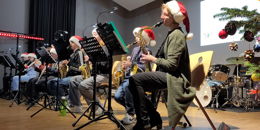 Schülerinnen und Schüler, Eltern und teilweise sogar Großeltern waren der Einladung zahlreich gefolgt. Zu erleben war ein stimmungsvoller Abend mit traditionellen und populären Weihnachtsliedern, die vom Publikum mal freudig und lautstark, mal besinnlich und nachdenklich mitgesungen wurden. Begleitet wurden die Lieder von der EMG-Schulband unter der Leitung von Annette Brink und Florian Fischer.