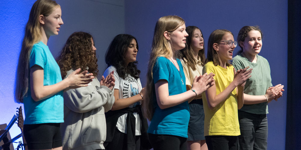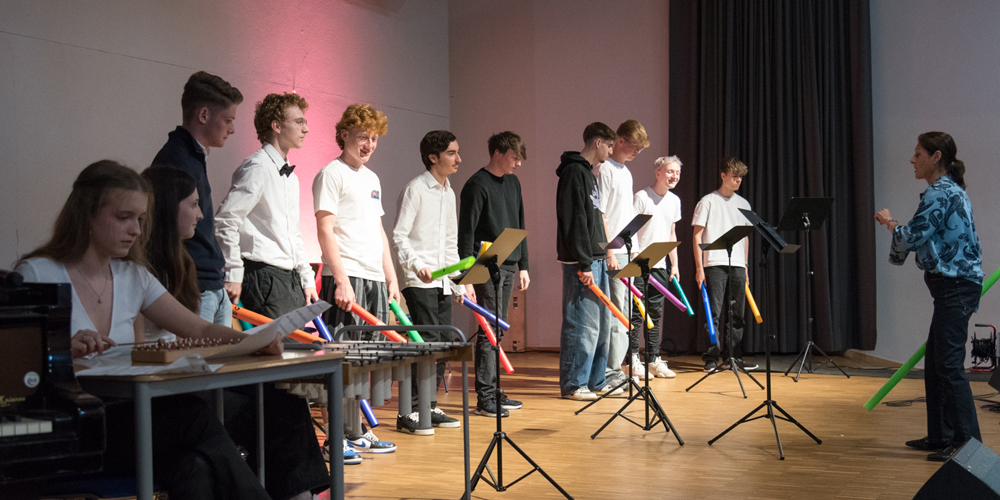 Darüber hinaus zeigten Schülerinnen und Schüler Ergebnisse aus dem Unterricht: Choreografien zu Musik aus dem Mittelalter, eine Hip-Choreo zu Musik von Ludwig van Beethoven mit akrobatischen Einlagen. Beeindrucken konnten auch die Darbietungen der Klassen 6c und 9c: So spielte und sang die Klasse 6c „Dance Monkey“ unter der Leitung von Florian Fischer und die Klasse 9c begleitete den „Root Bear Rag“ von Billy Joel mit farbigen Percussionklängen unter der Leitung von Samira Prégardien.