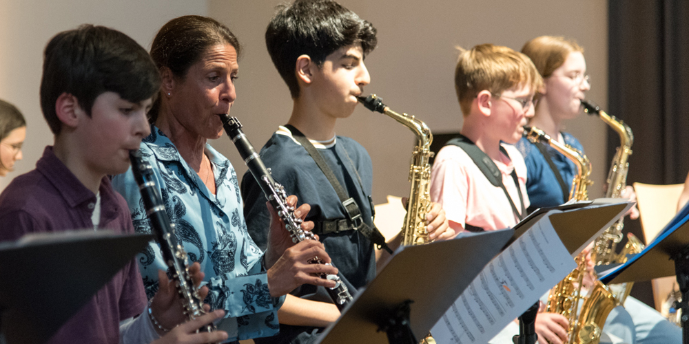 Auch die Bläser-AG der Stufe 5 hatte ihren allerersten Auftritt: Gemeinsam mit Stefan Oefner von der Josef-Metternich-Musikschule spielten die Schülerinnen „Banks of Ohio“.