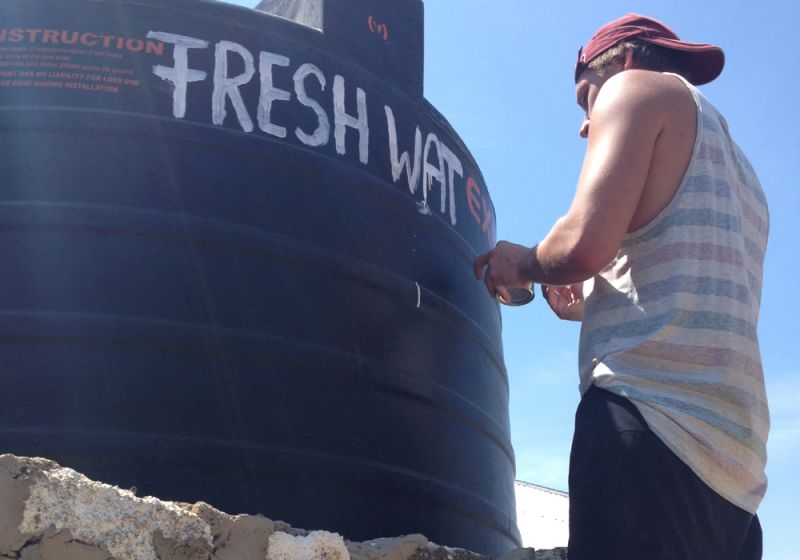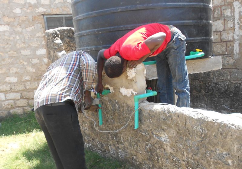 Für den Wassertank wurde ein Sockel aus Steinen, Eisen und Zement gebaut, der nach zwei Tagen fertiggestellt war und weitere fünf Tage zum Trocknen benötigte. Der Wassertank wurde mit einer Hauptwasserleitung und einem Hauptwasserregulator präpariert. Dadurch fließt das Wasser in zwei kleinere Wasserleitungen mit zwei Wasserhähnen, aus denen das Wasser entnommen werden kann.