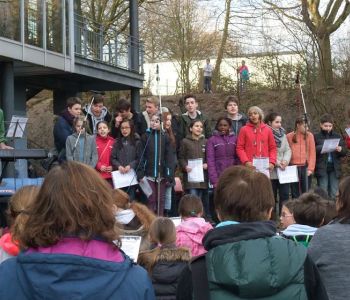 Mit einem Weihnachts-Open-Air-Konzert auf dem Schulhof hat der Chor des Ernst-Mach-Gymnasiums das Jahr 2015 stimmungsvoll ausklingen lassen. Während der ersten großen Pause fanden sich am Montag spontan Dutzende Schüler und Lehrer zusammen, um den Chor gesanglich zu unterstützen.