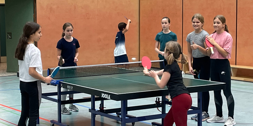 Großer Sport wurde dabei nicht nur bei den Finalspielen eines jeden Satzes zwischen den letzten beiden verbliebenen SpielerInnen gezeigt, sondern erst recht während der einzelnen Rundlauf-Durchgänge. „Gerade beim Rennen um den Tisch ist die koordinative Herausforderung, den Ball zielgenau zurückzuspielen, umso größer“, erläutert Heiner Philippek. „Da sind manchmal richtige akrobatische Stunts zu sehen!“, ergänzt Dirk Steines. Beide Sportlehrer organisierten gemeinsam mit den SporthelferInnen der 9. und 10. Jahrgangsstufe das Turnier.