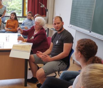 Sie wurden von den Schülern des Geschichte-LKs empfangen und zu den Räumen gebracht, wo sie jeweils auf einen Kurs der EF bzw. Q1 trafen. Trotz ihres hohen Alters beharrte die Zeitzeugin, die ich begleitete, darauf, die Treppe anstelle des Aufzuges zu nehmen.