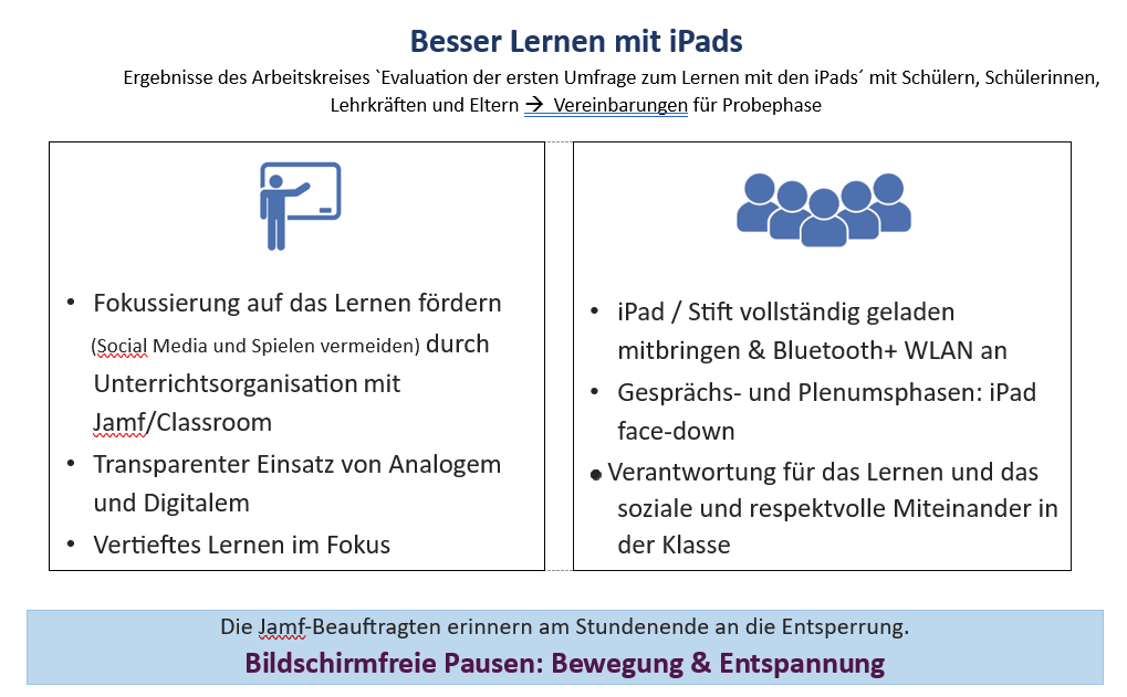 Der Einführung der iPad-Klassen 2023 gingen intensive Planungsprozesse voraus, an denen alle Gremien und Interessierten beteiligt waren. Besuche in anderen Schulen, Beschäftigung mit Fachliteratur, Infoabende und intensive Diskussionen in vielen Arbeitskreisen mit Eltern, Schülerinnen und Schülern, in Konferenzen und im Lehrerzimmer gingen den Entscheidungen voraus.